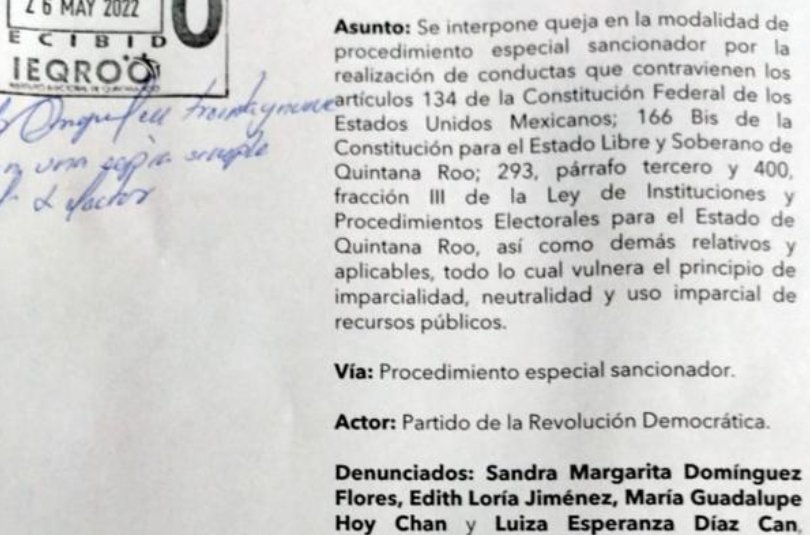 La representación del PRD ante el Instituto Electoral de Quintana Roo (Ieqroo) interpuso una denuncia contra seis funcionarios municipales de Puerto Morelos, por supuestamente realizar actos proselitistas durante horario laboral y con recursos del erario a favor de la aspirante a diputada del Distrito 4, Cristina Alcérreca Manzanero.